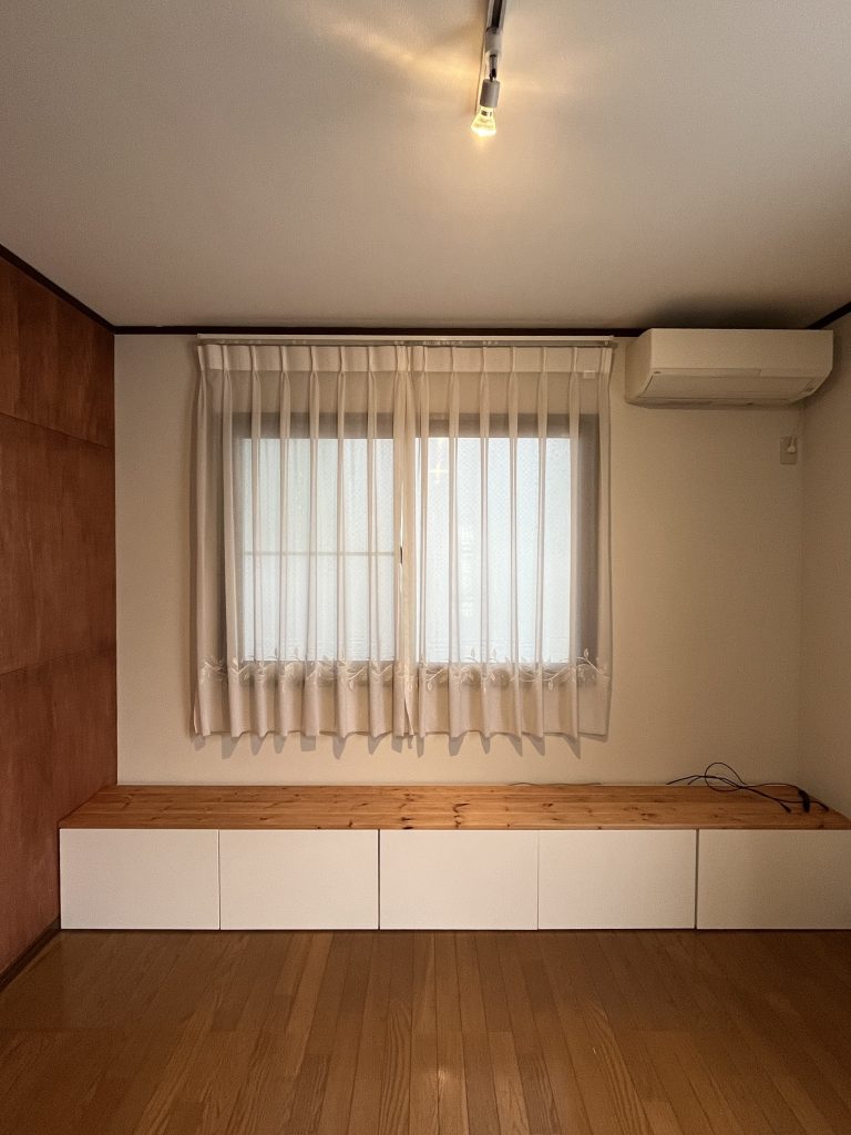 中途半端なサイズにするより、壁一面棚の方が備え付け感あるし、ベンチみたい見えてかわいいなって思い購入!