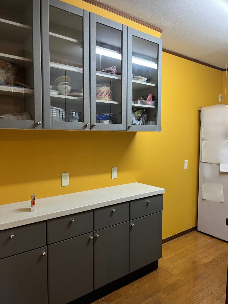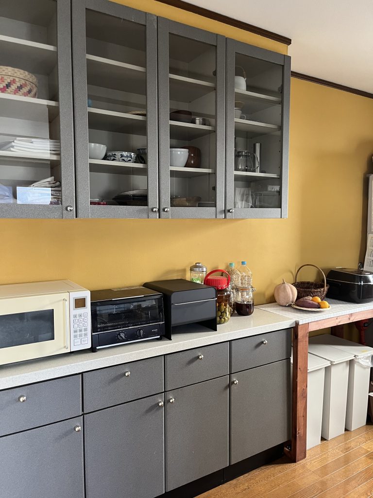 壁の色を変えれば、食器棚の色を変えたり、食器棚自体を変えたりしなくてもいい感じになるよね!と思いました。