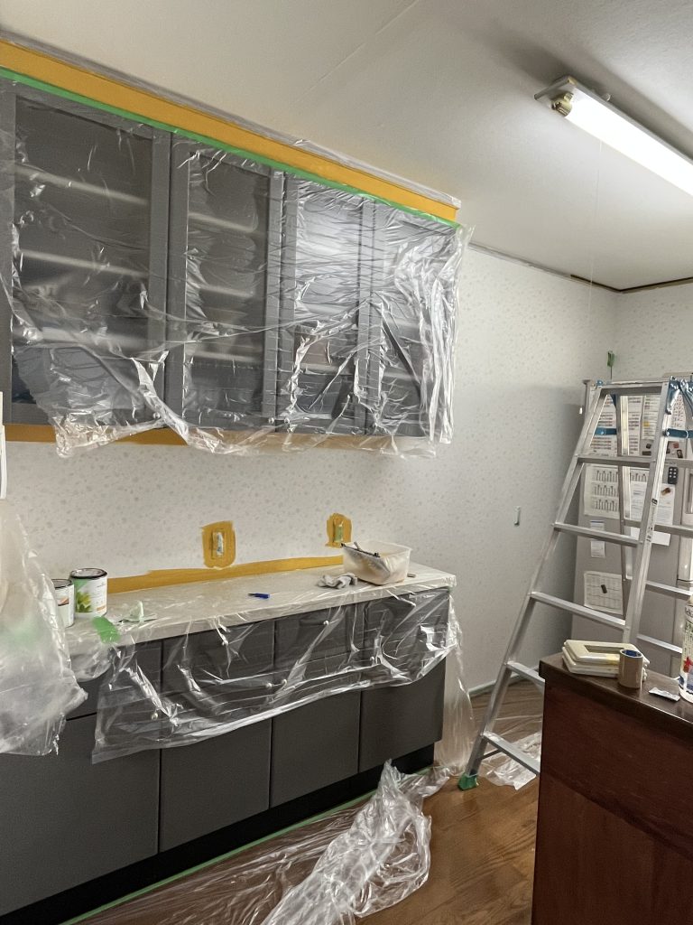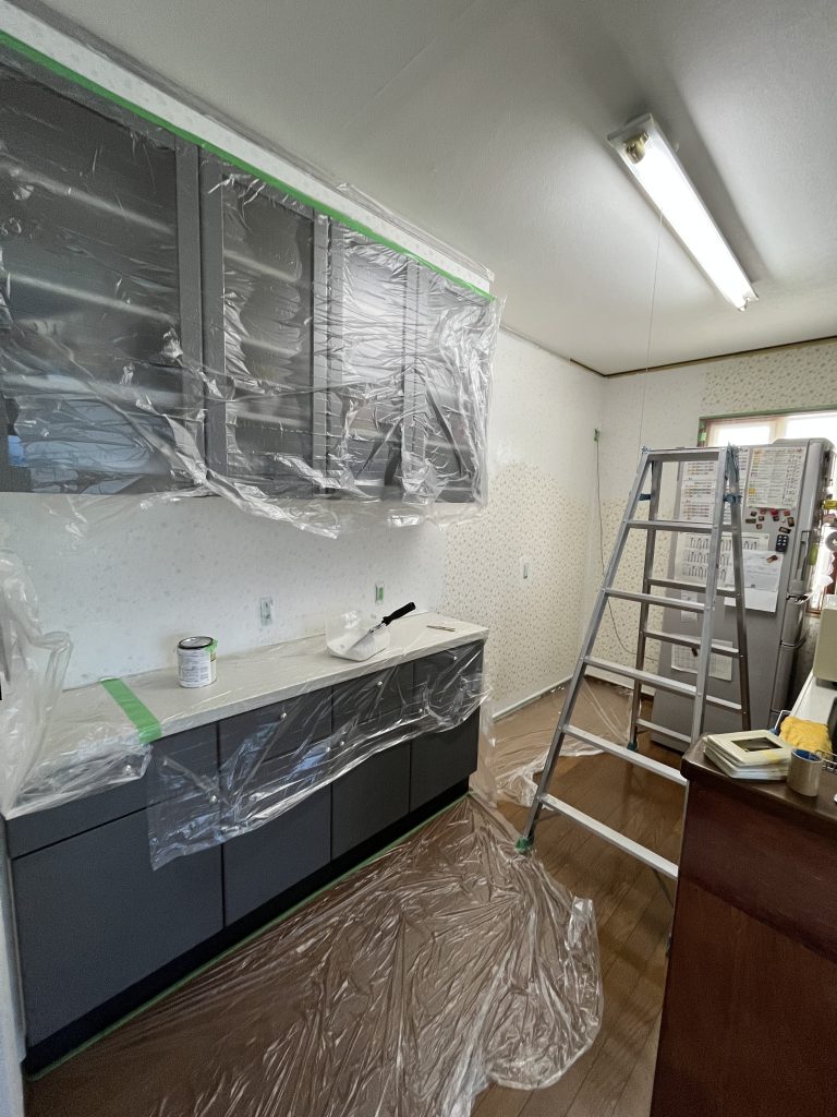 まず、食器棚や床などしっかり養生しました。